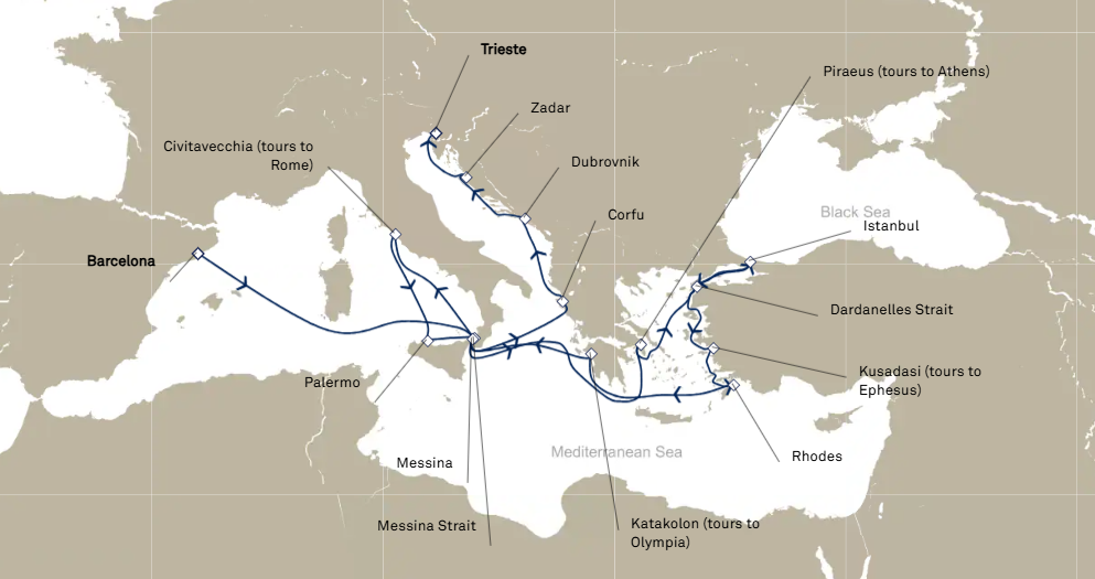 15 ports from Barcelona to Trieste
