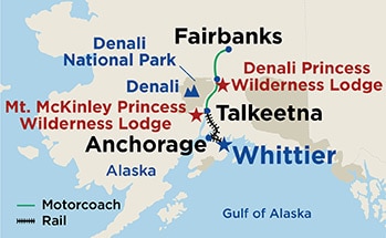 Vancouver · At Sea · Ketchikan · Juneau · Skagway · Hubbard Glacier (scenic cruise) · College Fjord (scenic cruise) · Whittier · Talkeetna (Overnight) · Denali Park (Overnight) · Fairbanks (Overnight)