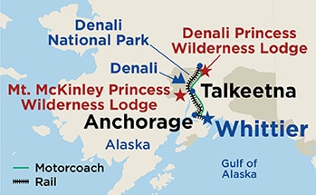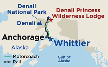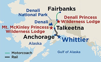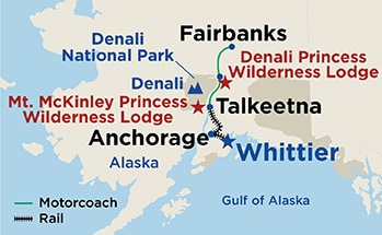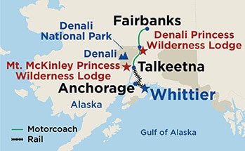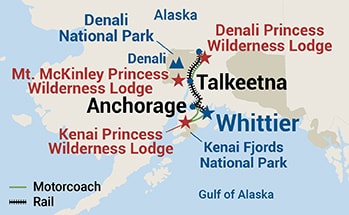 Vancouver · At Sea · Ketchikan · Juneau · Skagway · Hubbard Glacier (scenic cruise) · College Fjord (scenic cruise) · Whittier · Denali Park (Overnight) · Talkeetna (Overnight) · Kenai (Overnight) · Anchorage (Overnight)